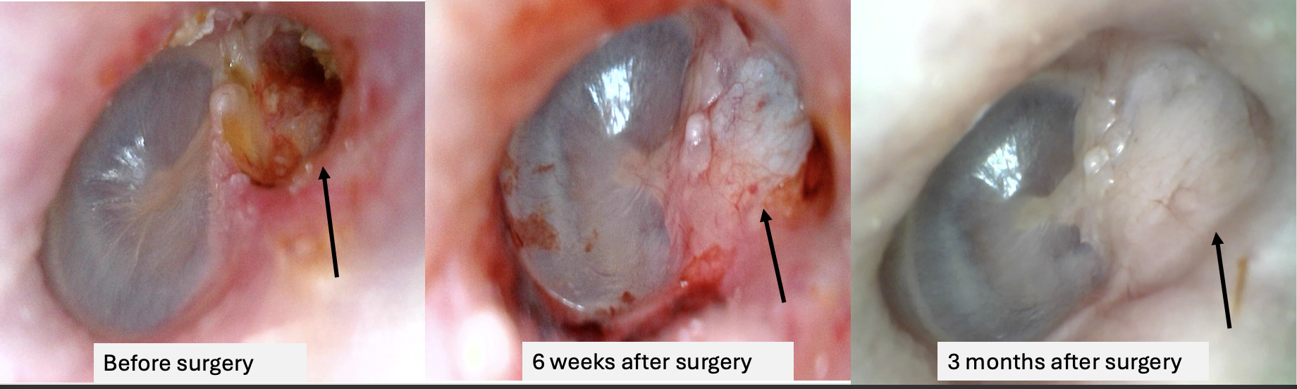 Refer to my Youtube Video page for examples of tympanoplasty (https://youtu.be/k6mSNaaAquU) and ossicular chain reconstruction (https://www.youtube.com/watch?v=sp02pHkCOPY) .